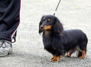 | 今回のドッグショーは横浜ベイブリッヂ愛犬クラブ展。 MLダックス、KLダックスともに通常システム。 リンゴ、ドリを出陳。 リンゴ、MLアダルト牝クラス3席。 ドリ、KL牝はジュニアクラスとアダルトクラス1頭づつしかエントリーなし。2頭でのウイナーズ戦を勝ちウイナーズビッチだがカードはなし。CH犬3頭+ドリのBOB戦敗退。 内容、結果については特に一喜一憂するほどのものではなかった。 ブリード審査終了後にジャスミンのバラエティー変更のための計測を行ってもらいました。 生後15ヶ月経過、かなり緩めに計って胸囲29.0センチ、絞って計ると胸囲27.5センチ。まったく問題なく登録変更可の結果でした。 ジャスはカニンヘンダックス、ヤングアダルト牝クラスでデビューすることになります。 ブリード審査:勝野克己 先生