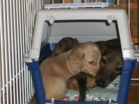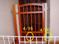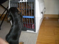 食欲旺盛のチビ達は、大好きなごはんが出てくる場所を良く知っている。私がキッチンに入るとみんな、ぞろぞろとこの扉前に集まりピーピーうるさく鳴いています。先日、ナナが柵を通り抜けようとしてお腹の辺りでひっかかってしまったので(4/16印のところ)、扉にダンボールを貼りました。もう通り抜けの心配はないと思っていた私の考えは甘かった。夕食の時間帯なのでチビ達もお腹が空いていたのでしょうか。ピーピー鳴いていたと思ったら、ヒィーヒィーと鳴く子がいる。どうしたかなと覗いたら、またもやナナ。今度は頭が抜けなくなって鳴いていました(4/20印が現場)。この鳴き声はただ事ではないと思ったモモとリンゴも駆けつける。必死に頭を抜こうとするナナを右手でなだめながら、左手で扉を外し救出。絶対に通り抜けしようと思わない隙間に頭を入れたナナ。救出された後しばらく、私の膝の上で不思議そうな表情。やんちゃなナナらしくすぐに遊んでいました。仔犬にはありえないことはないんですね。少しでも目を離すときはサークルに入れておかないといけないと反省しました。 |