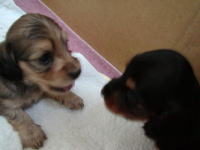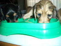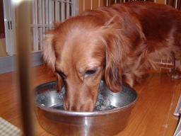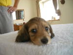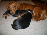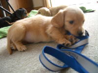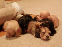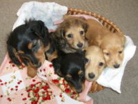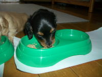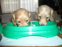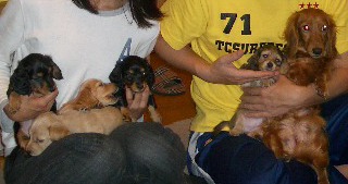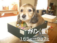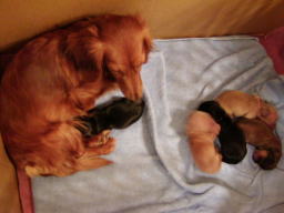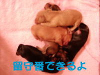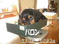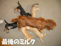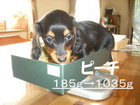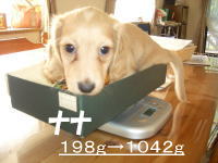 | とうとう引渡し前日になりました。チビ達のごはんの仕度は残り4回。体重計測は残り2回。ごはんはドッグフードをふやかしただけのごはんだけど、今日は「元気に大きくなるんだよ。家族に可愛がってもらうんだよ。」といつも以上に気持ちを込めて作りました。あ〜でもチビ達はそんな気持ちも知らずか、ガツガツとあっという間にごちそうさま。体重計測はいつもと違ってびっくり。箱の中で動いて正確な計測が出来なかったのに、今日はどの子も見てのとおり写真を撮ることができるぐらい。残り2回ぐらいは測らせてあげようと思ったのかしら。こんなにお利口さんに測らせてくれるなんて悲しいじゃない。チビ達の成長は見てのとおりすくすく。胴もダックスらしく伸びてきました。伸びた分少し胴回りが細く見えるかな。チビ達はダックスらしくなったことを私達に見せてから巣立ってくれるのね。親孝行なチビ達。今夜は長く長くチビ達と一緒にいたいけど、明日からは環境の違うところに行くので早く寝かせてあげよう。あ〜明日にはいないのね。うそのような本当の話だ。 |