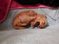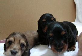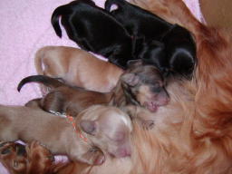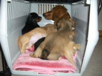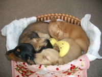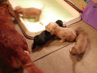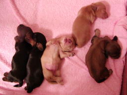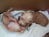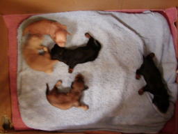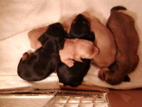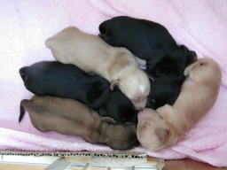 これは10日目の写真です。4日目の写真と比べてみると、色素が濃くなっています。特にクリーム色の子の鼻が分かりやすいですね。ピンク色の鼻が茶色に変わりました。体重も着実に増え外見の変化も分かるようになりました。近いうちに目が開きます。どの子が一番早く開くかな。 |