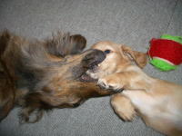 我が家のワンコは群れになっています。一番がモモ、二番がリンゴ、三番がチビ達です。偽妊娠中のリンゴはハウスの中にいることが多いですが、チビ達がじゃれ合って激しくなると仲裁に入ります。リンゴの仲裁現場をモモは総監督として眺めています。この関係、見ていると飽きません。ワンコ同士でルールが出来ています。多頭飼いならではの経験できることですね。 |