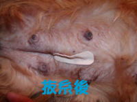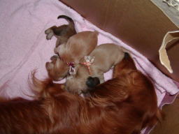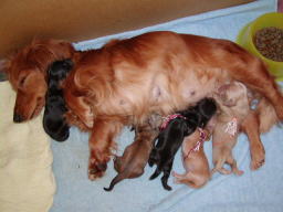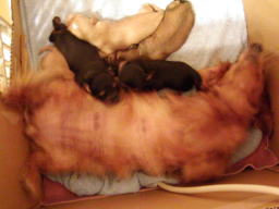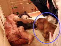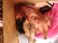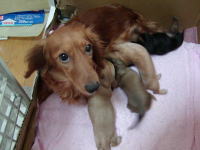 | あ〜良かった。男の子もミルクを飲んでいる。スゴイ吸いつき。おっぱい痛そう。モモも大変だ。手前のオレンジ色のリボンをつけている子が飲みップリがいい。体重も一番増えている。明日の体重測定が楽しみ。これだけ吸いついて飲まれているのでモモの食欲も出てきた。なかなか産箱から出てこなかったモモも今日は産箱の外で食べるようになったし、自分からお水も飲みに行くようになった。少し余裕も出てきたんだろうな。でも、産箱でミューミューって聞こえると急ぎ足で戻り赤ちゃんの様子を確認。1頭でも離れたところにいると口で咥えて寄せている。それからまた食事。お見事。 |