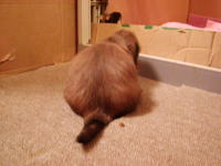 3/14の日記に書きましたモモが今(偽妊娠中も)、トイレを失敗する件、パパから回答がありました。野生動物は赤ちゃんを守るために、赤ちゃんのいる自分の巣のそばでは排泄しない。排泄したら自分の存在をばらしているようなもの。だから本能で赤ちゃんがいる(偽妊娠中も)ときはトイレでしないで遠くの違うところでする。言われれば納得。やだー、パパ、UPする前に言ってよ。皆さん知っていましたよね。恥ずかしい。それにしても本能というものはスゴイ。 |