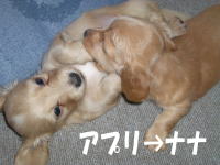 相変わらずリンゴは人気者です。なぜかチビ達はリンゴのバリケンで寝るのが大好き。きっとバリケンは狭く落ち着くという理由やみんなで固まって寝るという理由があるのでしょうが。チビ達の中でリンゴと特に相性がいいのがナナです。リンゴとナナはいつも遊んでいます。鼻先で転がしたり、噛んだりと結構ハード。ナナも立ち向かっていきます。そんなナナがいつもリンゴのバリケンで寝ています。 |